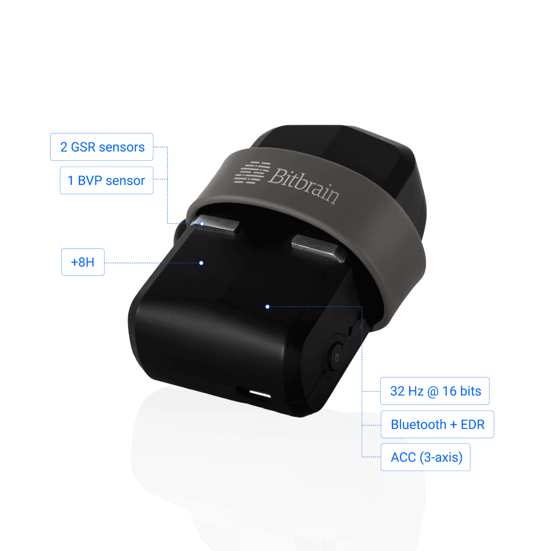 Integrated sensors for accurate GSR and BVP measurement. Includes a 3-axis accelerometer (ACC) to reduce motion artifacts. Wireless, compact, and ultralight amplifier. Bluetooth data transmission and microSD card backup storage.
