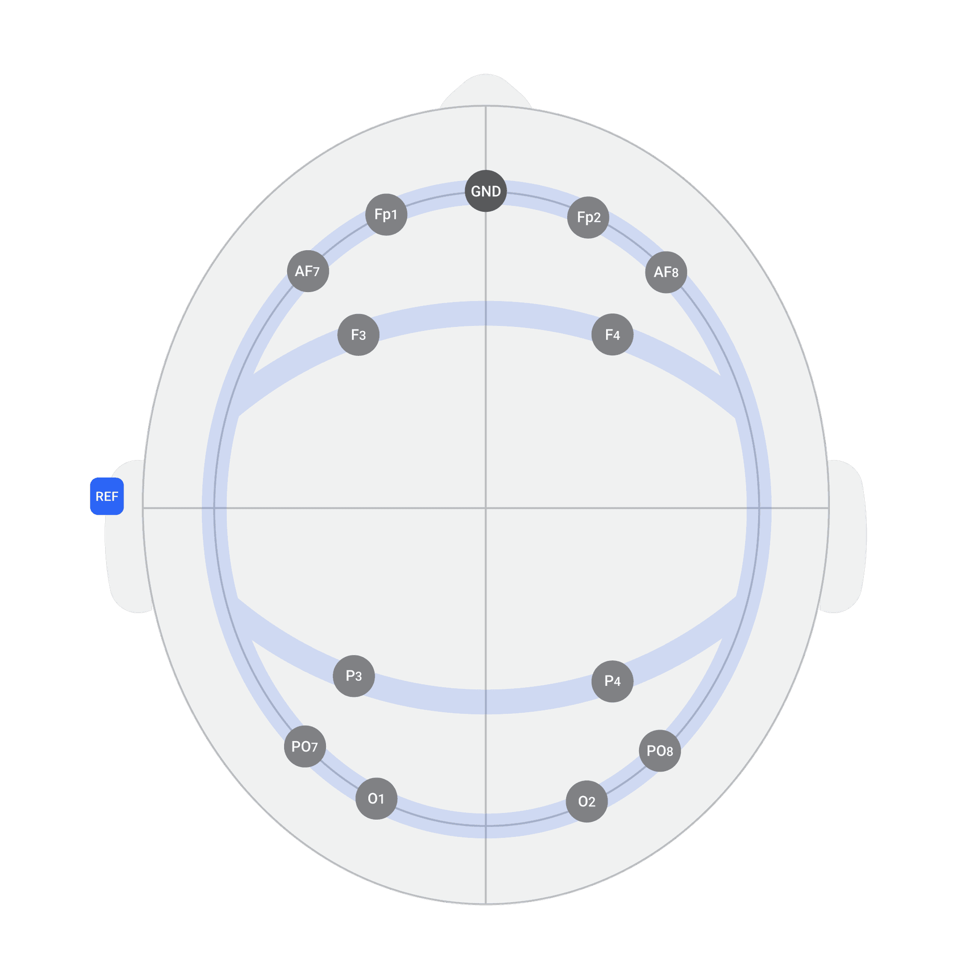 Diadem EEG features 12 EEG sensors, plus GND and REF, following the international 10-10 EEG system.