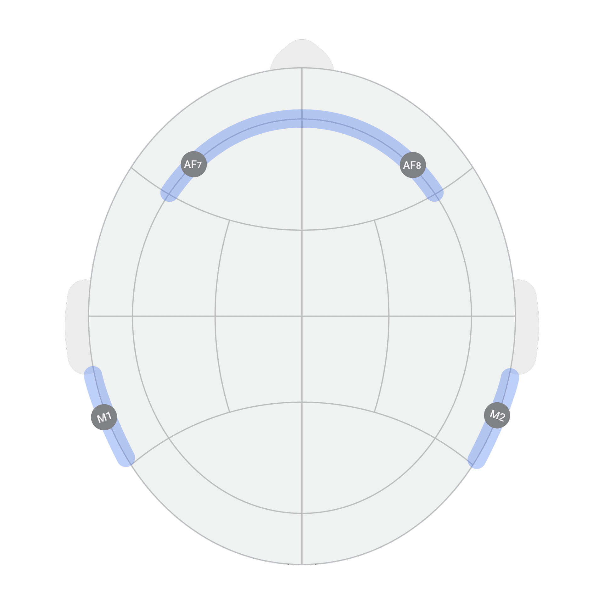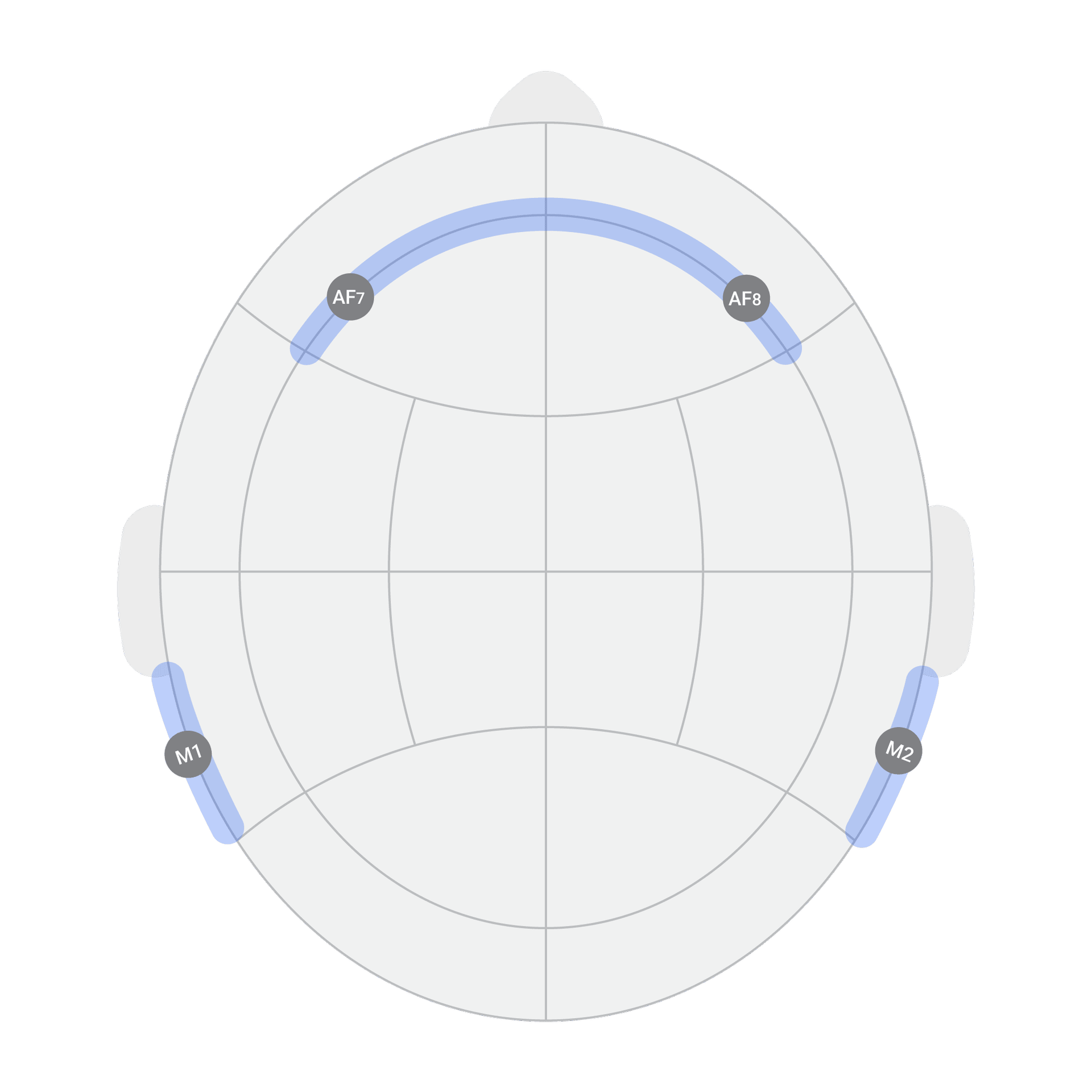 Ikon Sleep incorpora 2 sensores EEG snap pregelificados, además de GND y REF, siguiendo el sistema internacional 10-10 de EEG. GND está en M2 y REF en M1.