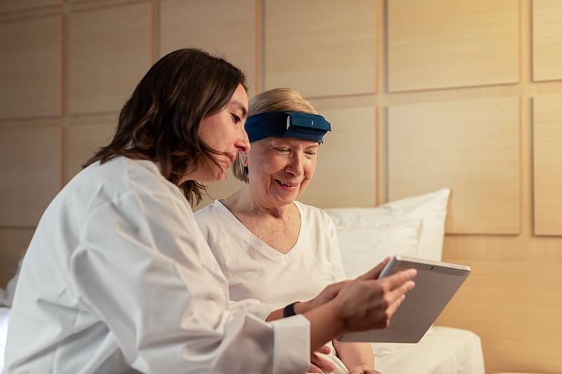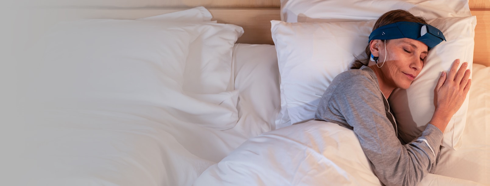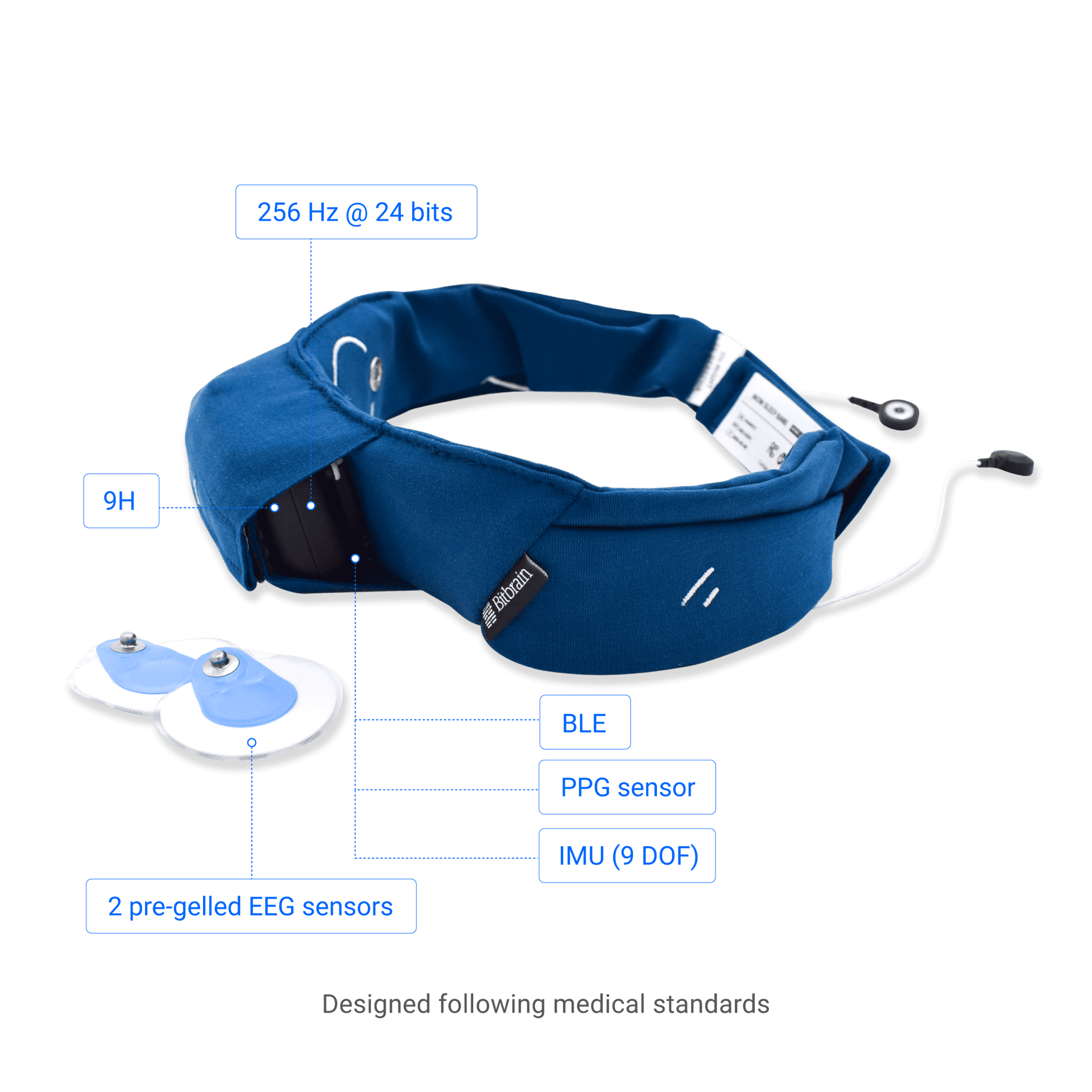 EEG para el estudio del sueño con 2 sensores frontales pregelificados y PPG integrado para la monitorización de la actividad cerebral y cardíaca. Destaca por su usabilidad y comodidad. Está desarrollado bajo estándares médicos para investigación del sueño en contextos reales, en cualquier momento y lugar.